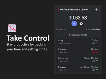 時間を追跡するだけでなく、YouTube Time Tracker Limiterは、デバイスに安全に保存されたデータを用いて、日次、週次、月次、年次の使用に関する洞察に満ちた統計を提供します。この拡張機能には、気を散らさない体験のための洗練されたダークモードも含まれています。ユーザーのプライバシーを優先し、すべての情報は外部サーバーに送信されることなくローカルに保存されるため、YouTubeを楽しみながら生産性を向上させたい人にとって安全な選択肢となっています。